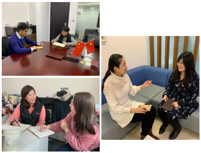 各黨支部委員、黨員之間全面開展“一對(duì)一”談心談話,圍繞“思想、工作、生活”等方面坦誠(chéng)交流,互相傾聽,找出問題與差距,共同探討解決與改進(jìn)方法。